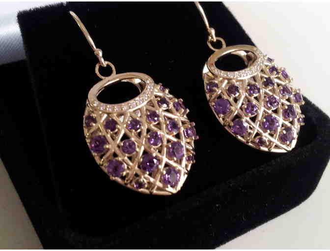 Stunning nest design earrings in 14k yellow gold! 22 genuine brilliant round cut diamonds (.8 mm) and 36 stunning AA quality genuine amethyst stones sparkle and shine to create a fabulous pair of earrings!