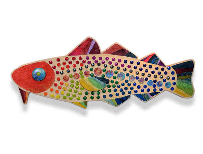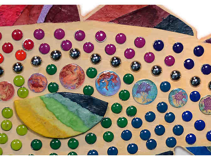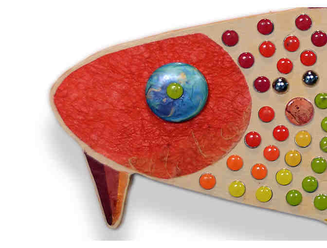 Artist Statement: As a jewelry designer and bead artist, I've participated in the Marblehead Festival of Arts, both in the Artisans' Marketplace and as an exhibitor. Rainbow Fish is an amalgam of my creative interests: first and foremost, my love of color, beautiful handmade papers, beads, and textural paint. The MFoA is a unique and wonderful event for Marblehead, and I'm thrilled to contribute my Rainbow Fish to the MFoA!