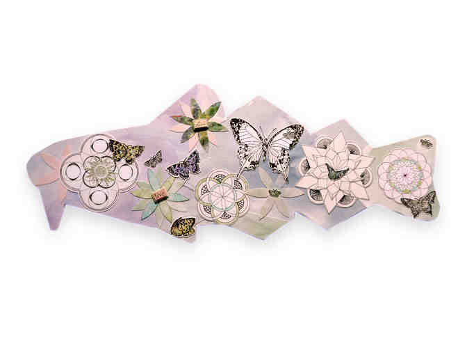 Medium & Size: Collage, watercolor, colored pencil, sacred geometry shapes hand-drawn with pen and ink, and stamped butterflies, on acid-free bristol board on wood. Glazed with Golden Medium. 21 7/8" L x 8 5/8" H x 3/4" D. For indoor display only.
