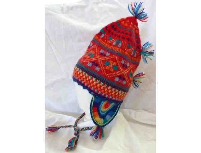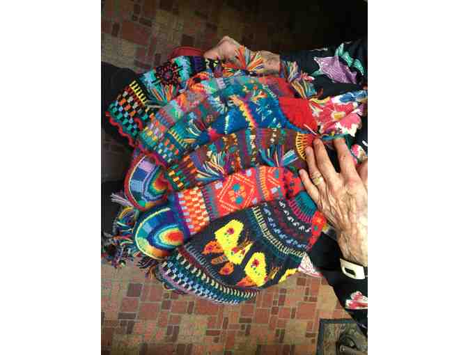 After reading the book Grace was intrigued and ordered 8 cones of brightly colored yarn, a crochet hook and knitting needles. That was the first step. The yarn had to be wound into skeins, rinsed, to be sure it did not run, hung to dry then wound into balls. Now she was set to go on the boat for the summer. Finding herself holed up in a harbor in Maine in thick fog aboad their sailboat with her husband, Dave, Grace started work on the hat. The first few rows were proving to be a challenge. Dave helped by reading the complicated directions to make the Puntas on the lower edge. The first hat was finally under way.