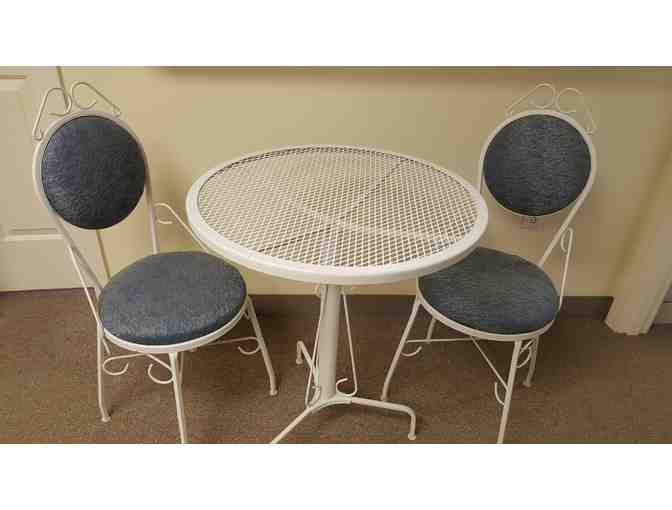 White Bistro Set with Two Light Blue Fabric Padded Chairs