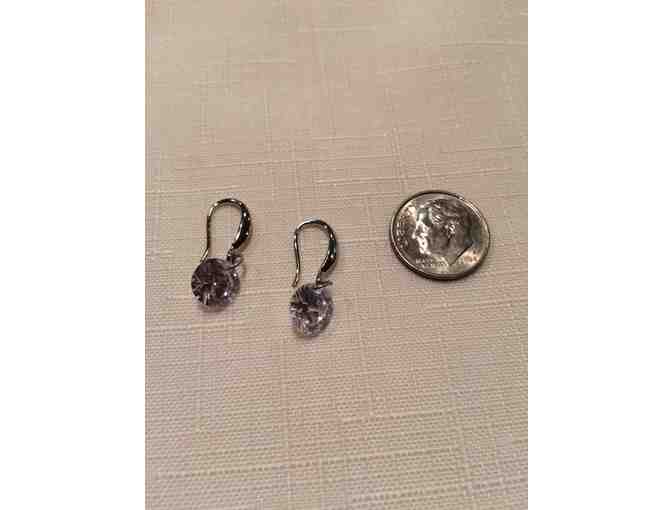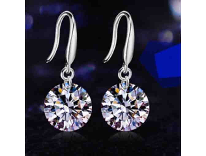 Elegant sterling silver, stamped 925, drill earrings holding a 2.0 Carat Round Swarovski Element crystal. Crystal size is 2 Ct weight. Earring size from top of earring to bottom of crystal is approximately 1 inch in length.