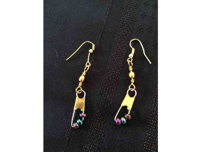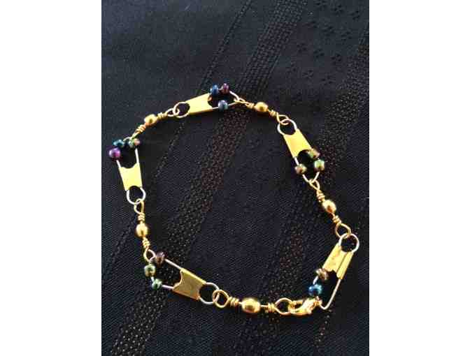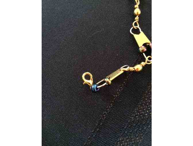 Hand made bracelet made of fishing swivels including matching pierced earrings. Swivels are steel and brass with blue/green and purple beads. Bracelet is 8 1/2 inches and is adjustable. Earrings dangle 2 1/4 inches.
