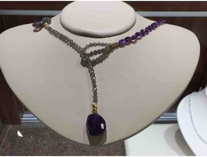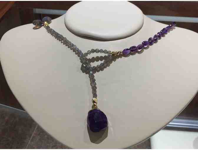 Handmade genuine Amethyst and Labradorite lariat necklace with gold accents.