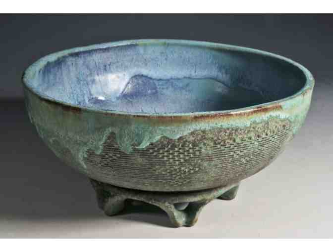 Fruit Bowl: 5" high x 10.25" wide. Ornamented exterior; greens and blues