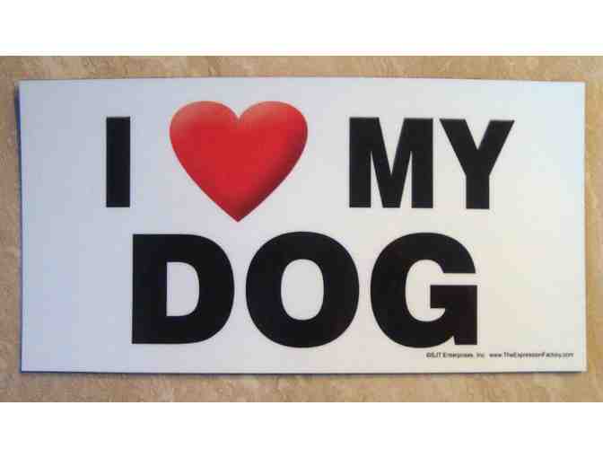 New "I Love My Dog" Magnet. This magnet is great for the car, in a locker, on a fridge, on a file cabinet or virtually any metal surface. Waterproof & proudly made in the USA. Measures 7.75" x 4". Made by Fun Magnets!