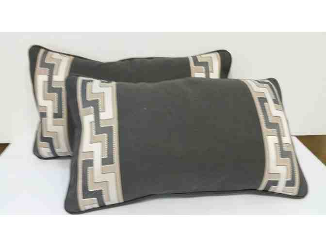 Two beautiful linen lumbar pillows with tape trim from Ann Prince Interiors.