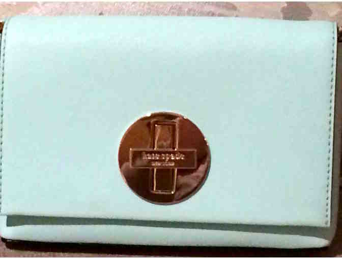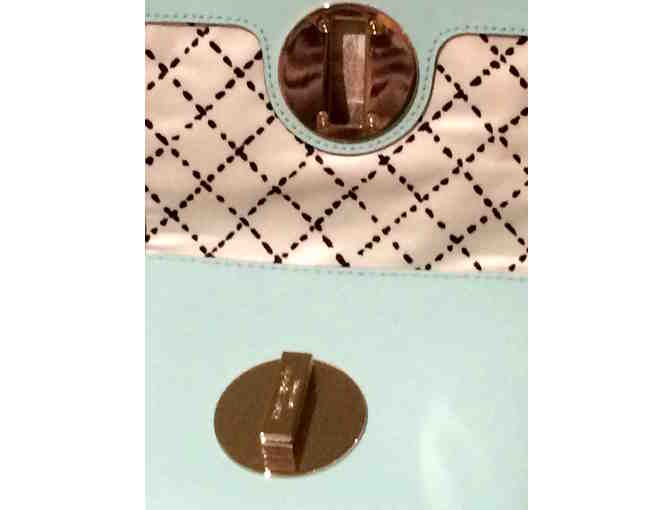 Kate Spade (New York) Cross-body Purse in turquoise with silver-toned hardware accents. Newbury Lane line. Kate Spade logo on front hardware. Interior checkered (white/black) - see pictures