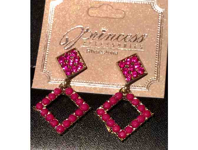Earrings gold-tone with pink stone accents in geometric square shapes