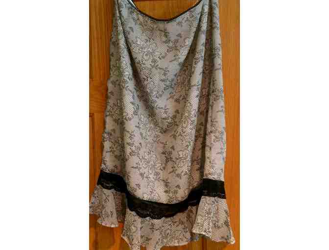 Black and white flowr motive 100% silk skirt by Spencer Jeremy - size 10; with black lace ruffle accent.
