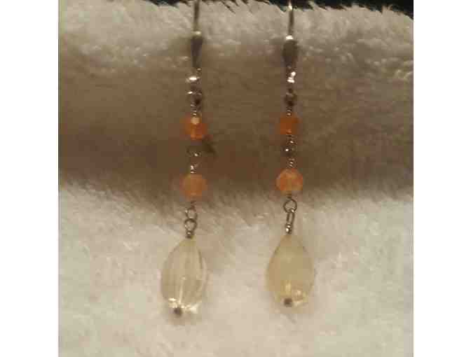 Sterling Silver earrings with two small Carnelian beads highlighting large, faceted teardrop shaped Citrine beads.