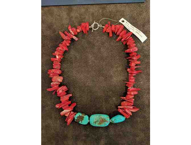Striking turquoise and coral necklace of 19" in length with decorative sterling silver clasp.