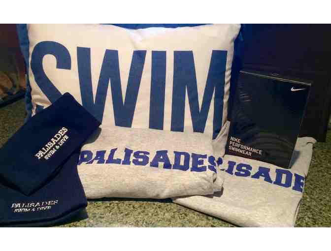 PALI Swim-Team Basket Contains the following: Nike Performance Swimwear (size M/30, color blue/black), 2 beanie hats, 2 T-shirts (grey, sizes L & M), one decorative featherfilled pillow "Swim", "Price of Gold" by Mark Flagel