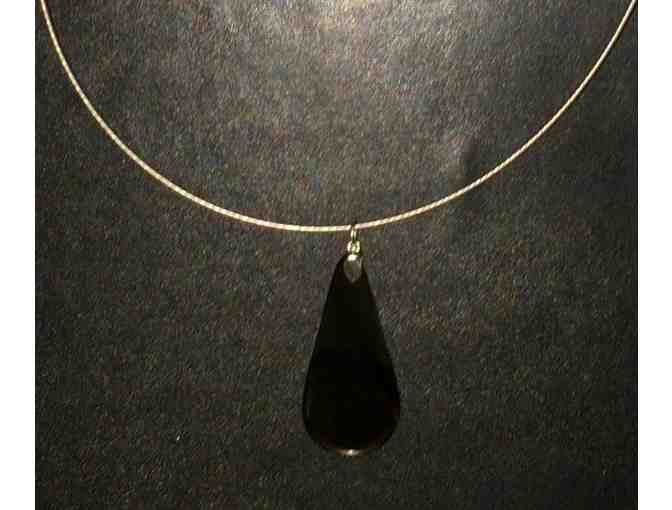 Choker style necklace stiff wire necklace with brown teardrop pendant with screw closure.