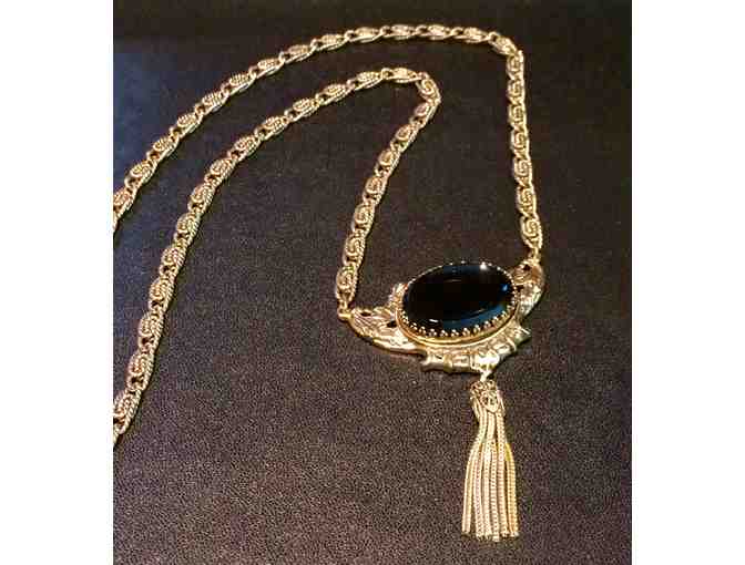 Vintage WHITING and DAVIS Necklace Intaglio Cameo Pendant Filigree Frame Fringe Tassel 1970's // Vintage Designer Costume Jewelry