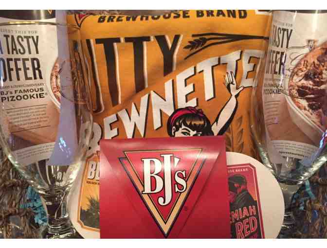 Basket contents: $25 courtesy card, a BJ's beer logo t-shirt (XL), 2 beer glasses, and 2 pizookie coupons.