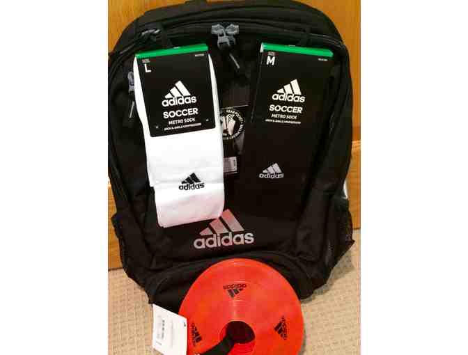 Contents: Stadium Team Backpack (black), Safety Orange Cones, 2 pairs of soccer socks (1 M-black, 1 L-white)