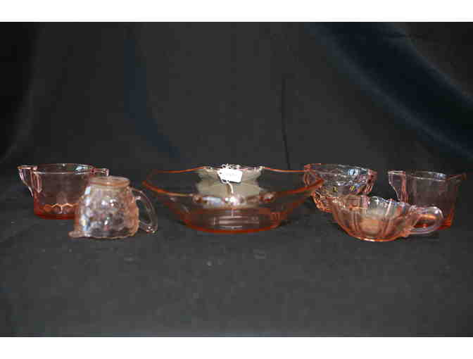 This gently-used collection of pink depression ware includes a large serving bowl, a cream and sugar bowl, and 2 pouring dishes. Beautiful additions to your collection.