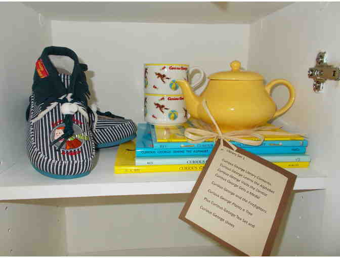 Curious George turned 75 this year. Here is a beginning library of H.A. Rey's favorite monkey. A china tea pot, two matching tea cups and an adorable pair of Curious George booties complete the birthday package. 5 books: Curious George Learns the Alphabet; Curious George Visits the Dentist; Curious George Gets a Medal; Curious George and the Firefighters; Curious George Plants a Tree.