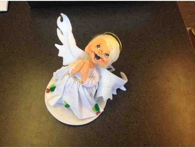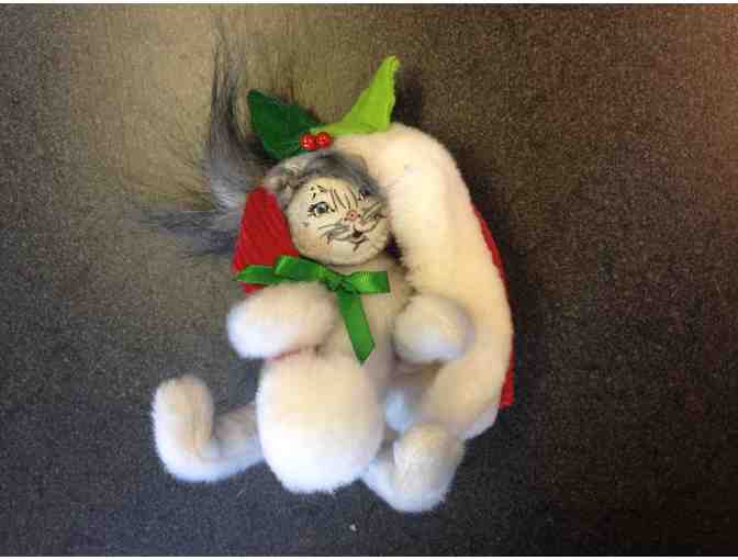 These adorable Annalee figurines are the perfect holiday decorations! One is of a blonde angel (7") with white wings and wearing a white dress decorated with holly. The other is of a very soft gray kitty (5") playing in a bright red Santa hat. Cute and festive!
