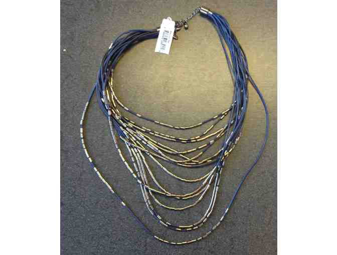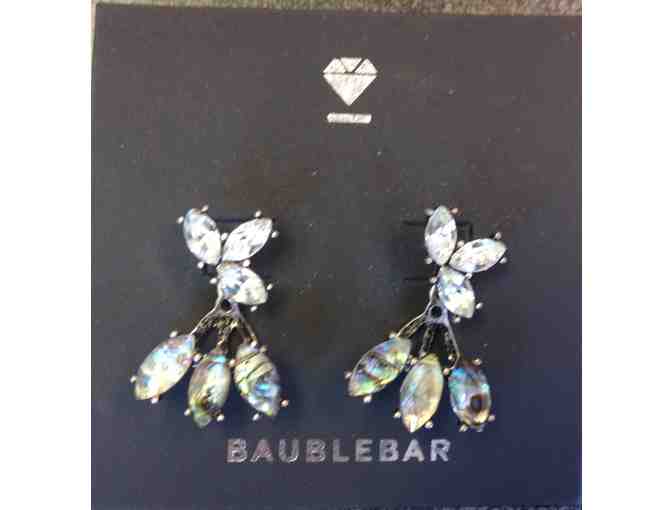 This gorgeous "liquid" navy necklace (26") with dark gray beads is an absolute show-stopper! Additonally this item features a pair of gorgeous Baublebar earrings with a trio of diamond charms and a hanging trio of iridescent gems colored with blues, greens, and whites. These will make any outfit go from drab to fab!