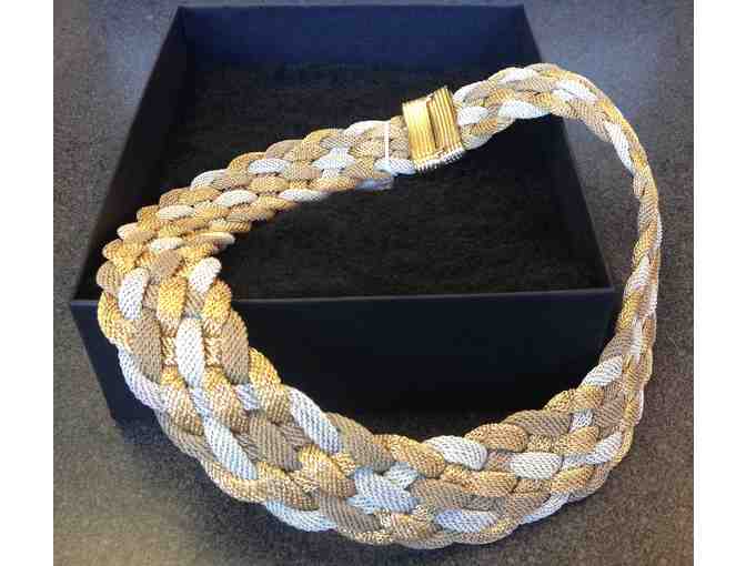 This elegant 18" necklace by Natasha features braided strands of gold, gray, white, and brown which all go stunningly together. The perfect accessory for a night out!