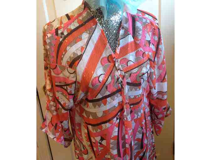 This orange, pink, gray, and white floaty jacket (size 1) from Chico's is the perfect addition to any outfit!