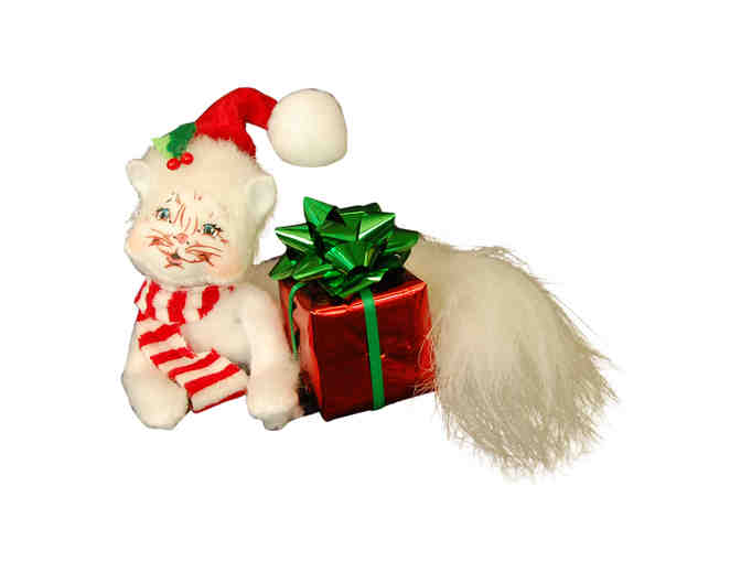 This adorable Annalee decoration features a cute white kitty wearing a red Santa hat and scarf curled around a shiny red present with a bright green bow. What a purr-fect holiday decoration!