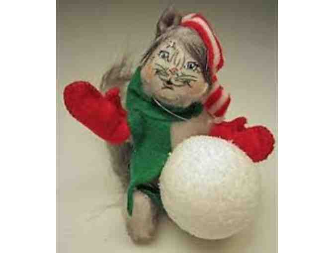 This whimsical Annalee decoration (4") features a cute gray kitty wearing a long striped red hat, a green scarf, and red mittens holding a giant white snowball. What an adorable addition to any home!