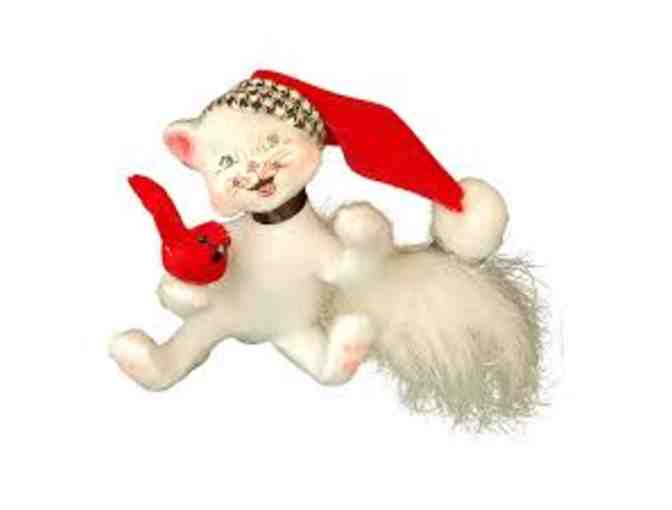 This adorable Annalee ornament (4") features a white kitty wearing a red hat and holding a red cardinal. The purr-fect addition to any Christmas tree!