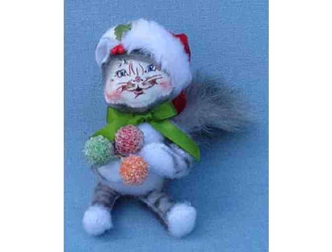 Be delighted by this Annalee decoration (4") featuring a gray kitty wearing a red hat and holding three sparkly green, red, and orange balls. The purr-fect holiday decoration!