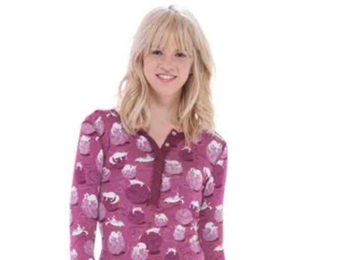 Feel cozy and look adorable with this 2 piece dark pink pajama set (large) featuring cute white kitties in a variety of fun poses such as sleeping on a ball of yarn. These pjs also feature 3/4 sleeves, a draw-string waist, and can be machine washed and dried. The perfect thing to slip into after a long day at work!