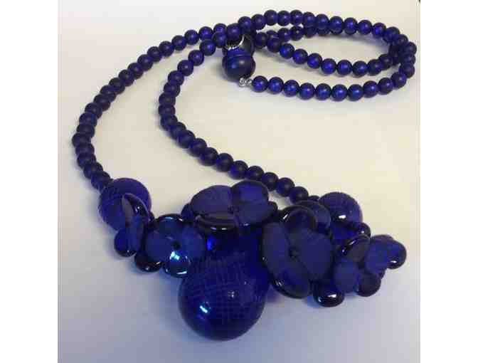 An original by Christina Defalco, this lucite necklace is a stunning deep blue color with expertly arranged flower and orb ornaments. Absolutely gorgeous and the perfect piece to make any outfit glamorous. Approximately 34".