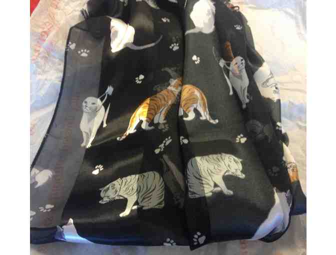 This black oblong scarf is 100% polyester but feels like silk. It features adorable orange, white, and gray kitties all in cute poses and is also dotted with white paw prints. The perfect accessory to make any outfit purr-fect!