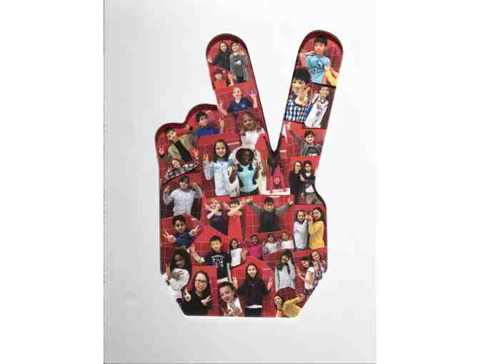 Peace! A collage of color photographs of the class making peace signs with their hands. The photos are glued onto a 16x20 piece of 1/4" gator board. Then a 16x20 piece of 1/4" gator board with a cut out peace sign is placed on top.