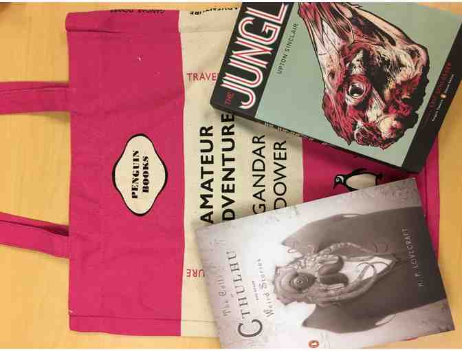 Penguin Classics, two books and a tote bag: The Call of Cthulhu and Other Weird Stories by H. P. Lovecraft, The Jungle by Upton Sinclair, and tote bag with Amateur Adventure by Gandar Dower.