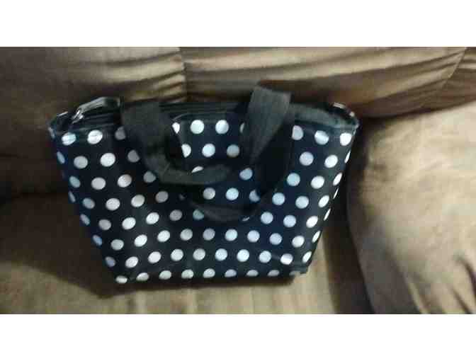 Adorable heavy canvas purse with zippered top, plastic interior to prevent leaks 15 in long 10 in tall..