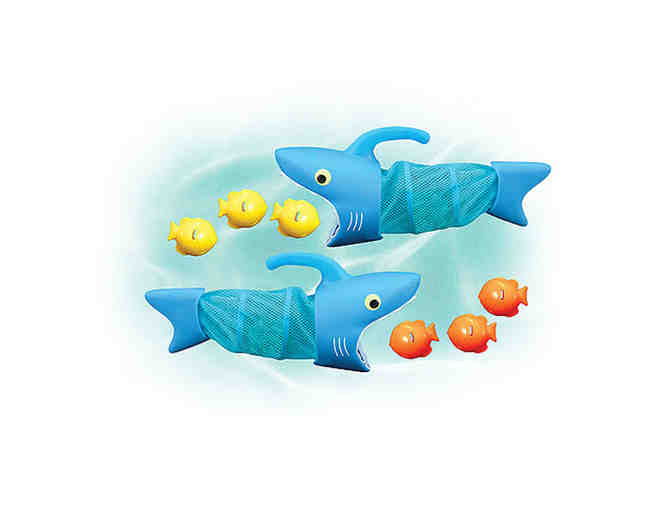Speed like a hungry shark to gobble up tasty fish! Just grab onto the handle of a Spark Shark net and swim through the pool to scoop up the fish sinkers. The set comes with tow shark nets, six colorful sinkers and lost of play ideas for races, games and more!