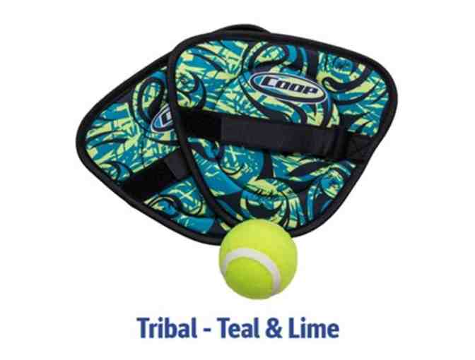 "Mine, I've got it!" All members of the family can enjoy the Coop Hydro Catch game, regardless of their age and skill level. Hook and loop fabric on the inside of the round mitts "snags" the ball at almost any angle, and there's a strap on the outside to slip your hand under for a secure fit. All the items in the set are designed to float, so you can play catch in or out of the water.