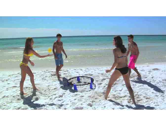 Game set includes: 1 easy to set up durable frame, 1 all-weather ball, 1 cinch bag for travel and storage, and game rules and instructions.