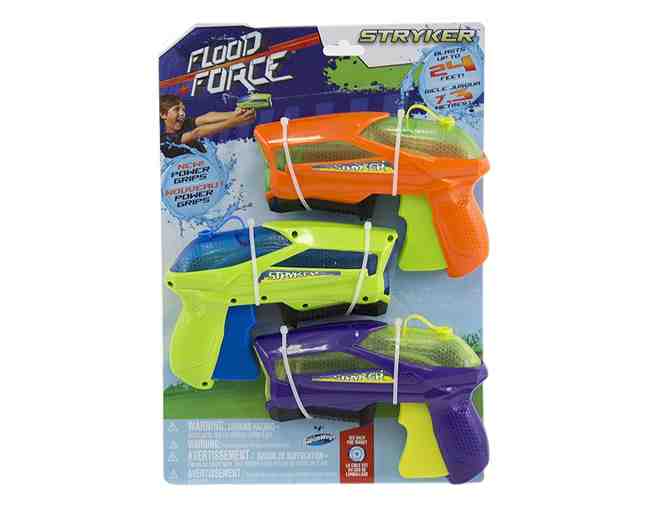 The Flood Force Stryker water blaster from SwimWays features power grips shooting action for maximum soaking power! The cool transparent tank design, colors and super big trigger will make you the leader of the pack at your next water battle. 6 oz water capacity. Shoots up to 24 feet. Three Stryker water soakers per pack.