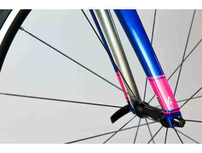 Jacob, 11, of West Virginia inspired Speed. If Jacob had a superpower, he “would want to be really fast, because it would be fun to go fast.” To achieve this sleek, metallic look, first a base-coat of real crushed aluminum is applied. A clear coat and transparent “wash” of color follows to create the anodized midnight blue base. Three primary colors, representing prismatic light, streak across the frame, and the crushed aluminum base shows through in the logo accents, inner stays and fork. Speed is a 56cm frame. The bike will be raced by Adam De Vos of the Rally Cycling team at the 2017 Amgen Tour of California, one of the world’s biggest bike races.