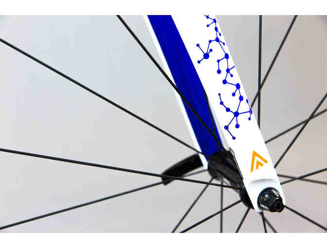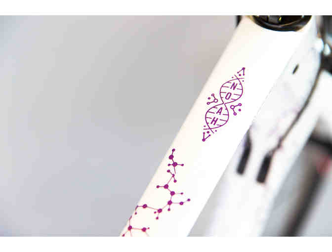 Noah, 10, of Florida provided the inspiration for Science. In our survey, Noah said, “I like math and science, because I like experiments.” We did our own experiment and used a unique masking technique to color the frame. It starts with a vibrant, 5-color fade, followed by a coat of pearl white. Clusters of molecules allow the colorful gradient to peek through, also on full display inside the chainstays and fork. The Diamondback logo is displayed in a one-of-a-kind outline. Science is a 58cm frame. The bike will be raced by Danny Pate of the Rally Cycling team at the 2017 Amgen Tour of California, one of the world’s biggest bike races.