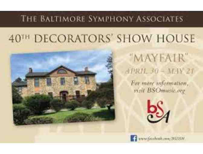 Congratulations to the Baltimore Symphony Associates on creating and supporting the 40th Decorators' Showhouse--always a sensory delight! You're bidding on four tickets for this very worthy and fun event at "Mayfair" in Lutherville/Timonium April 30-May 21, 2017.
