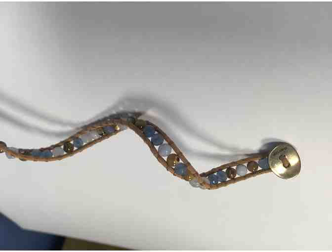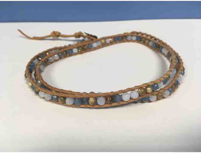 This women's wrap bracelet features a henna leather strand framing an arrangement of blue mirage semi-precious stones and etched beads. This wrap bracelet is the perfect accessory for the season; wear it to your next beach outing to complete your look. Don't forget to layer with your favorite silver tone cuffs and single bracelets.