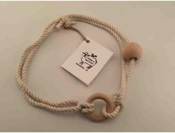 Can be worn everyday, while nursing, wearing baby, or travelling - always ready to play when baby is close! Handmade with all natural cotton lining and wooden beads - made by a mom in Brooklyn to be carried by Acorn Toy Shop.