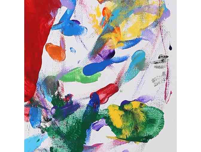 Our vision was for the kids to use their thumbs (and, if willing, feet) to populate the grid with unique thumb and footprints to each child. We had the kids come out in pairs to have a “buddy” when it was their turn. What was fun to watch was the unique approach each child took when painting. Some were shy at first, dipping their fingers slowly and doing one or two small thumbprints on the canvas. Some jumped right in and used long sweeping lines with all fingers and hands, trying to cover as much of the canvas as possible! Some wanted nothing to do with their feet getting painted and others ripped their socks off and wanted to stomp all over it! What was wonderful to see was all of the children coming together to create one beautiful piece of art that reflects their individual style and approach. They were great sports!