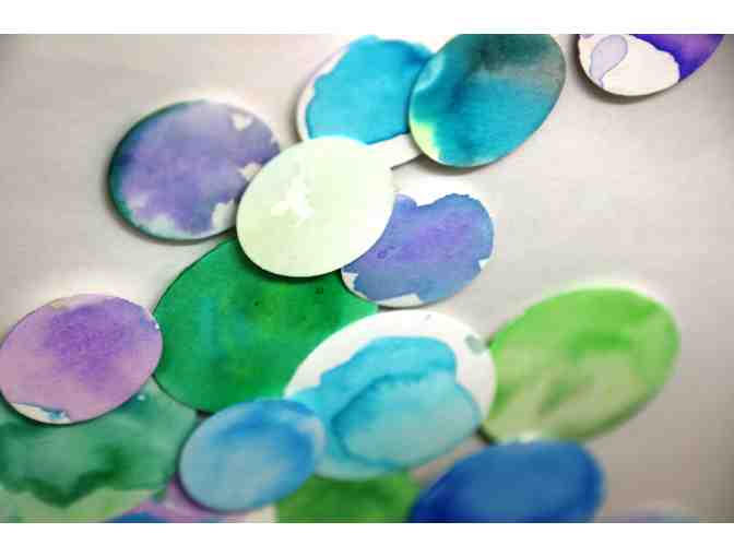 The children in the Robin program had so much fun working together on their class project. Everyone had the chance to paint their own batch of unique pastel watercolor, the "bubbles". It was fun for all the Robbins to watch what happens when we add more or less water to the watercolors and to see them mix together. Then the entire class' circles were put together to make this special picture for you. We named it "Dreaming of Bubbles".