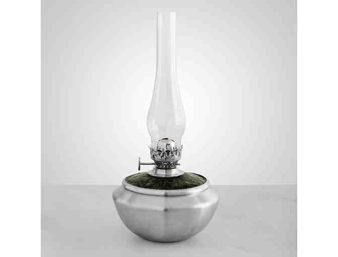 This beautiful oil lamp features an intricately crafted green leaf design. It is 8 3/4" tall from the bottom of the lamp to the top of the globe. Holds 7 oz. of oil.