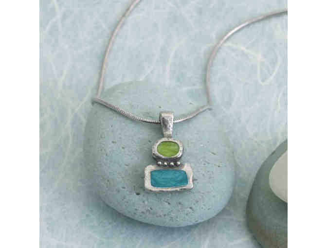 The Enhance / spring Necklace is made by hand in our Middlebury, Vermont workshop. It has an 18" Sterling silver snake chain with lobster claw clasp. Pendant 6/8" high.
